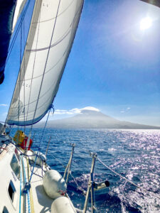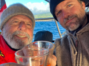 Am Samstag, den 01.03.2025 begann dann der nächste Törn, der unsere neue kleine Crew von nur drei Seglern inklusive mir, an das portugiesische Festland führen sollte. Nur leider begann nun etwas, was nach einhelliger Meinung ungewöhnlich ist. Die Tiefdruckgebiete, die von Westen, also der kanadischen Ostküste auf den Atlantik hinausziehen, haben normalerweise eine leichte Poltendenz, das heißt, dass sie auf die Distanz leicht nach Norden ziehen und so ab den Azoren eher in Richtung Biskaya oder Irland ziehen. Für unseren Törn galt das nicht, sondern mehrere starke Winde mit sich führende Tiefdruckgebiete sollten von nun an in kurzer Folge über die Azoren ziehen und dann tendenziell nicht nach Norden, sondern entweder ziemlich direkt nach Osten oder sogar leicht südlich in Richtung der Straße von Gibraltar. Alles in allem eine verzwickte Lage, denn wissentlich in Bereiche, in den 50 Knoten Wind oder mehr zu erwarten sind, hineinsegeln, ist auf keinen Fall verantwortungsvoll. Also entschieden wir uns von Horta, mit einem Zwischenstopp in Velas auf Sao Jorge, den Schlag nach Ponta Delgada auf Sao Miguel zu planen, um dort notgedrungen drei bis vier Tage Pause zu machen und den ersten Sturm durchziehen zu lassen. Der Plan funktionierte und wir kamen sicher und vor dem Wind auf Sao Miguel an, nachdem wir einen sehr schönen Tag auf Sao Jorge hikend verbracht hatten. Auch die Überfahrt nach Ponta Delgada verlief gut, auch wenn sich der Wind etwas weniger und kürzer als erhofft einstellte. So war es ein guter shake down, bei dem die neue Crew Roci, während eines ersten Übernachtschlags, kennen lernen konnte.