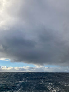 Mit jeder Seemeile, die wir nach Norden fuhren, wurde es etwas kälter. Und spätestens ab dem 31 Breitengrad, dem Bereich, ab dem wir von nun an immer wieder die Südflanken der Tiefdruckgebiete suchen würden, war auch tagsüberwarme Kleidung notwendig. Doch nicht nur die kühleren Temperaturen, sondern auch das zunehmend instabile Wetter mit Regen und teilweise starken Winden verlangten der Crew einiges ab.