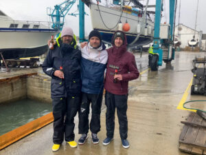 Dann flaute der Wind auf eine nicht segelbare Stärke ab, die uns zwang den Motor zu starten. So kam die gesamte Crew etwas zur Ruhe und zwischendurch kam sogar ein paar Mal die Sonne heraus. Mit ca. 6 Knoten näherten wir uns dem Festland und warteten auf neuen Wind, der sich leider erst in einem Gebiet wieder einstellte, das ich Orcaland nenne. Den Bereich ab ca. 40 Seemeilen vor der Küste, in dem es in den letzten Jahren immer wieder zu Interaktionen von Orcas und Segelbooten kam, die in einigen Fällen für die Segelboote mit beschädigten Rudern, im schlimmsten Fall sogar mit dem Sinken der Yacht, einhergingen. Und auch wenn es mittlerweile durch Social Media und Messenger Gruppen viele Informationen über den aktuellen Aufenthaltsort der Gruppen gibt, ist es doch immer eine nervenaufreibende Angelegenheit. Da empfohlen wird diesen Bereich so schnell wie möglich zu passieren, haben wir da gar nicht lange gefackelt, sondern sind unter Motor, mit der Unterstützung des Großsegels und ständigem Ausguck gehen durch das Gebiet geprescht. Offensichtlich hatten die Orcas dieses Mal besseres zu tun und so konnten wir auch diese Etappe ohne Beschädigungen und vor dem nächsten Tiefdruckgebiet sicher beenden. Gegen 12.00 Uhr passierten wir die Barra Nova, die Einfahrt in die Lagune von Faro und gingen erstmal vor Anker. Wieder hatten wir einen Durchschnitt von über 6 Knoten gehalten und die ca. 530 Seemeilen in ungefähr dreieinhalb Tagen absolviert. Schnell genug, um meinen, auf den Nachmittag, verlegten Krantermin wahrzunehmen. Wir nutzten die Pause vor Anker, um uns etwas auszuruhen und dann Roci für eine kleine Schwebeeinheit vorzubereiten. Um 15.00 Uhr erreichten wir den Nave Pegos Boatyard in Faro und wurden zügig und fast komplikationsfrei gekrant. Roci steht nun in Faro auf Land, während ich dies hier Schreibe und wartet auf ein kleines Makeover und die Reparatur der kleinen Dinge, die immer anfallen.