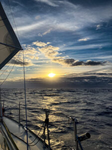Nach Osten hieß es nun für eine geraume Weile. Immer wieder zogen Tiefdruckgebiete im Norden vorbei, brachten Wind und Regen, brachten uns voran und zogen wieder ab. Leider ließen sie uns oftmals mit aufgewühlter See und kaum segelbarem Wind zurück. So kämpften wir uns mal nach Osten, mal nach Nordosten voran und so langsam kam der letzte kritische Teil in Sicht. Die letzten knapp 800 Seemeilen, die uns nach Norden, bzw. nach Nordosten fehlten und uns nach Horta führen würden. Und wir passten ein gutes Wetterfenster ab. Dank unserer Wetternavigatorin Julia, die uns wie immer vom Festland aus beraten hat. In dieser Zeit zogen, dank des Hochdrucks im Süden die Tiefdruckgebiete nach Norden und eher in Richtung Irische See und ermöglichten uns so eine sichere Anfahrt auf Horta, wo wir nach ca. 2500 Seemeilen und 18 Tagen auf See, erschöpft und glücklich anlandeten. Expliziter Dank gilt hier auch noch mal meinem Vater Pit, ohne den wir diese Tour nicht geschafft hätten.